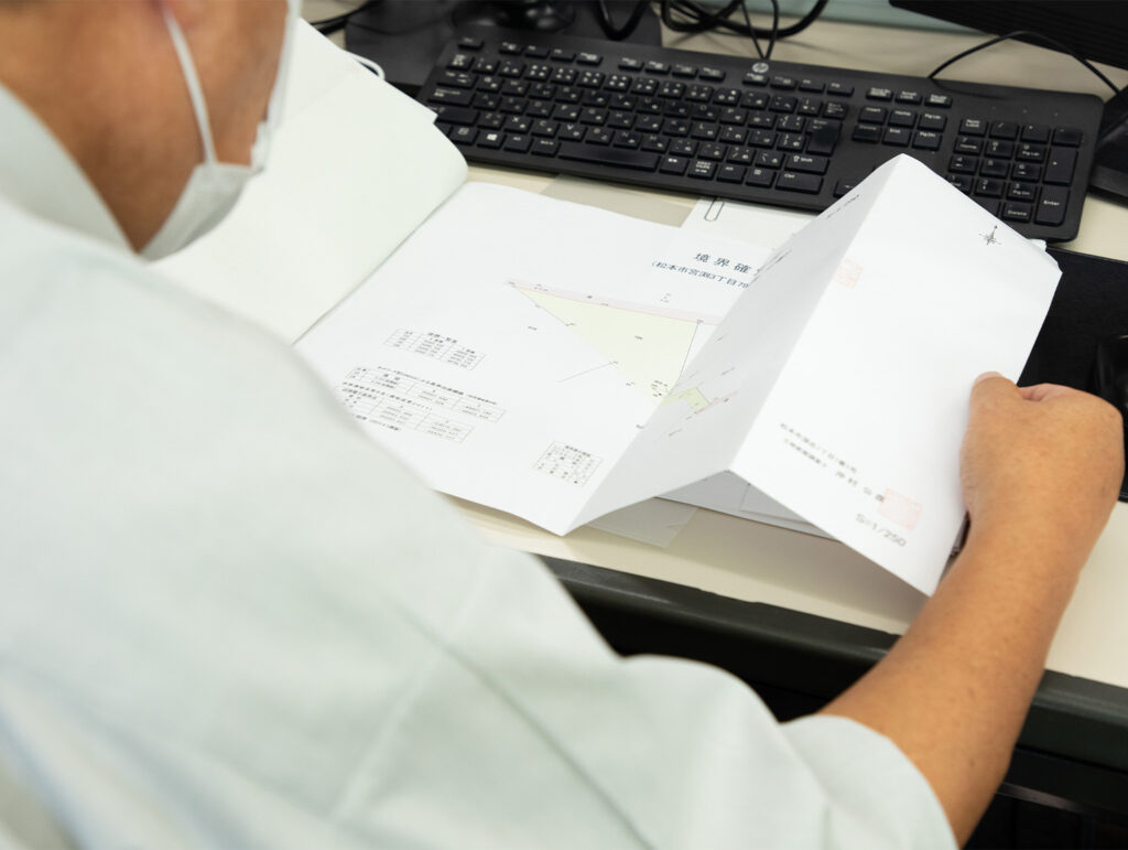 登記情報や地積測量図、公図を確認し、土地の形や面積を把握します。